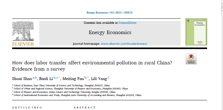 近日,财经学院李宝礼副教授(通讯作者)与博士后合作导师华东理工大学邵帅教授(第一作者)在《Energy Economics》发表论文How Does Labor Transfer Affect Environmental Pollution in Rural China? Evidence from a Survey。《Energy Economics》位列SSCI期刊经济类一区,是能源经济学领域的国际权威期刊,近5年影响因子为5.790。