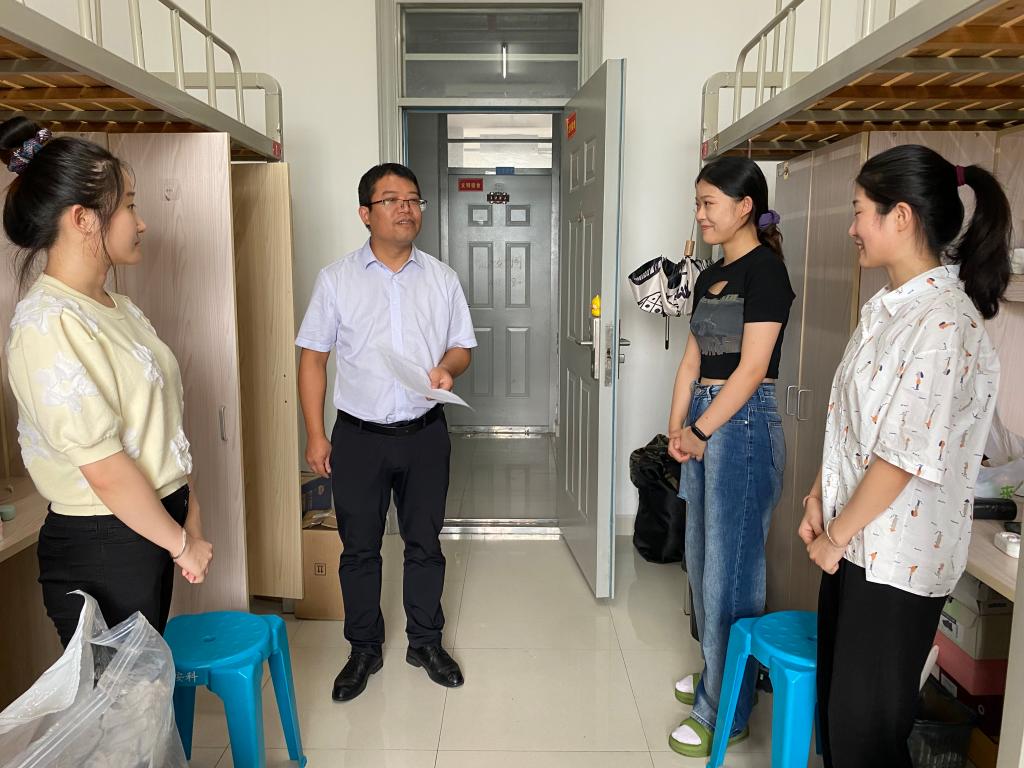 在新生宿舍,学院领导对同学们的到来表示热烈欢迎,并与他们亲切交谈,零距离了解他们进校后的适应情况、衣食住行情况;提醒新生切实做好常态化疫情防控工作,提高安全防范意识,注意人身、财物和信息安全;鼓励同学们调整状态,合理规划大学生活,提高自律与独立生活能力,互助友爱,勤奋学习,志存高远,积极融入到班集体,尽快融入到大学的学习生活中。