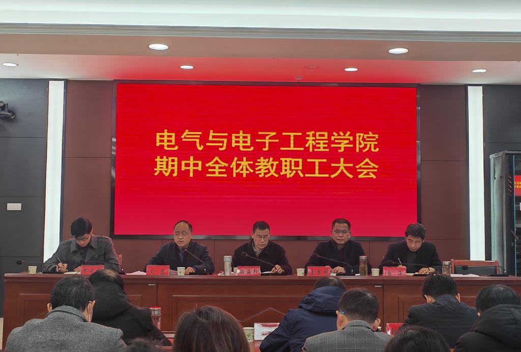11月30日下午,电气与电子工程学院于西辅楼111报告厅召开本学期期中全体教职工会议,学院党委书记骆海邦,党委副书记、院长夏显明,党委副书记、纪委书记尚磊,副院长国海,副院长樊晓宇及全体教职工参加了会议,会议由骆海邦主持。