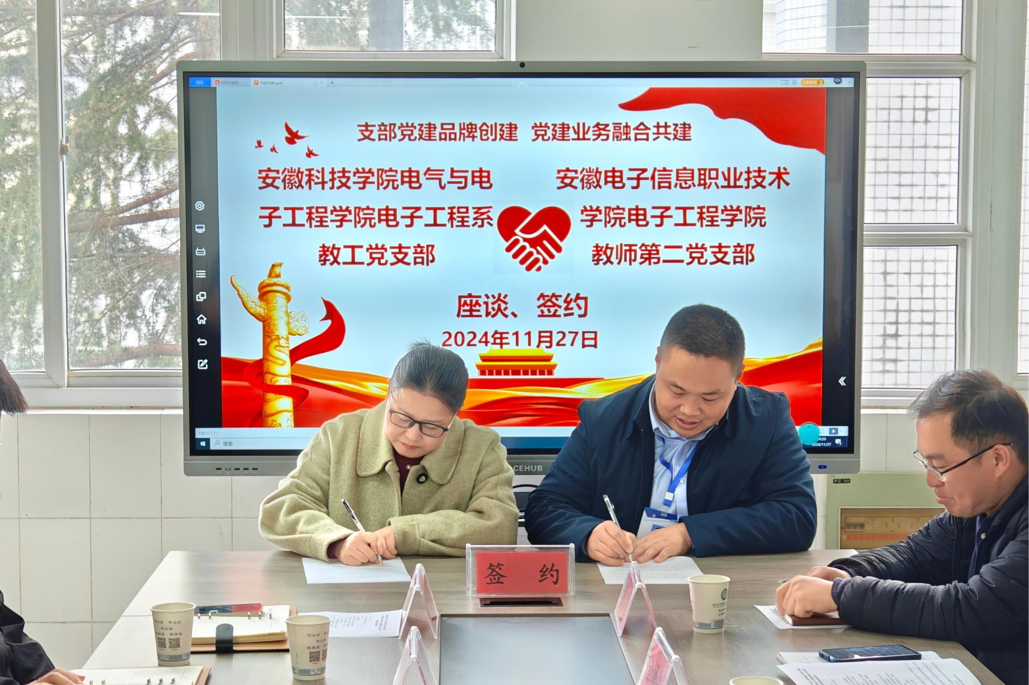 为拓宽高校基层党组织党建工作渠道,构建高校资源共享、相互促进、优势互补、共同提高的党建工作格局,2024年11月27日下午,拼搏平台电气与电子工程学院副院长樊晓宇及电子工程系教工党支部6名党员教师赴安徽电子信息职业技术学院与电子工程学院教师第二党支部开展结对共建主题党日活动。安徽电子信息职业技术学院电子工程学院院长方庆山参加了结对共建签约仪式。