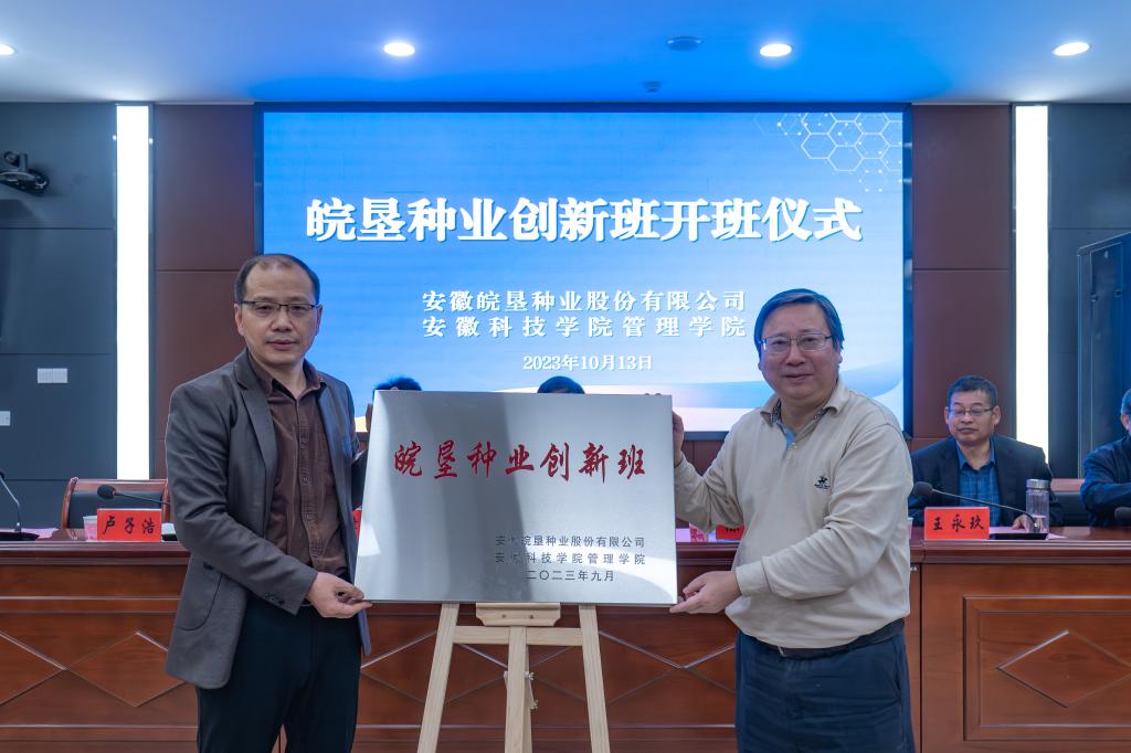 开班仪式上,陈传万院长代表管理学院发表了热情洋溢的致辞。丁景良宣读了关于成立“皖垦种业创新班”的决定,并与陈军共同为“皖垦种业创新班”揭牌。“皖垦种业创新班”学生代表王浩作表态发言。(特约通讯员:李永鹏 摄影:程圳 审核:丁景良)