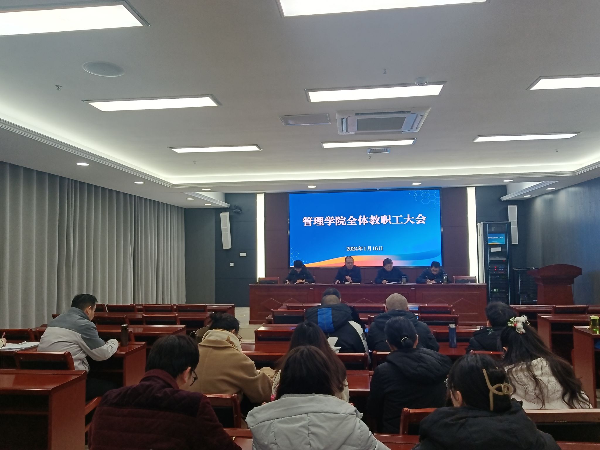党委副书记、院长陈传万作了题为《踔厉奋发 团结奋进 全面推进管理学院高质量发展》的工作报告。全面梳理和总结了过去一年学院在科研、人才等重点工作领域所取得的成绩,并希望全体教职工牢固树立责任意识、忧患意识、质量意识和纪律意识,坚守教书育人初心,强化使命担当,紧紧围绕2024年目标任务,充分发挥积极性、主动性、创造性,狠抓任务落实,确保学院事业发展再上新台阶。