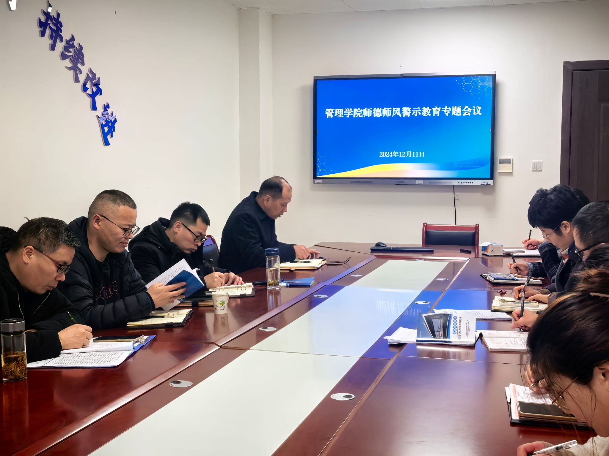为进一步加强师德师风建设,提升教师职业道德素养,12月11日下午,管理学院在西附楼204会议室召开师德师风警示教育专题会议。学院党政领导出席会议,全体教职工参加会议。会议由院党委副书记、纪委书记陶漫主持。