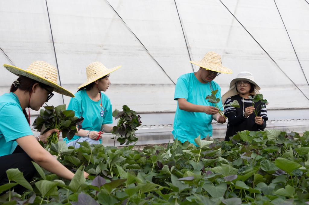 位于怀远县淮西示范区的番薯种植园,这里的西瓜红普薯32号品种正长势喜人,同学们来到这里,看到科研人员正在进行番薯种苗的脱毒实验。实践团成员产生了极大的兴趣,纷纷拿起剪刀、挽起裤脚、扛起锄头下田地“自找苦吃”,在技术员的带领下,大家顶着炎炎烈日参与到采剪试验样品工作中,将所需的番薯植株转移到实验室中进行培育改良,现场观摩脱毒试验操作流程。