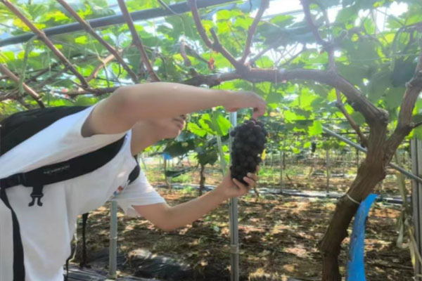 首日,实践团来到葡萄种植生态园。在负责人的带领下,团队成员参观了园区,了解到葡萄的病虫害防治、水肥管理、田间管理、机械使用等葡萄种植相关知识,同时还学习到果农如何运用科学管理方法提高葡萄产量和品质的技术。最后还体验了普通采摘,成员们小心翼翼地挑选着每一串葡萄,摘葡萄的过程并非易事,在保持葡萄完整的同时,还要注意不损伤枝叶。汗水与泥土的味道交织在一起,团队成员深刻感受到了农民的辛勤与不易。