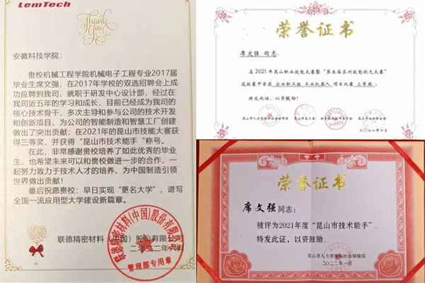 日前,总部位于江苏省昆山市的联德精密材料(中国)股份有限公司向拼搏平台发来热情洋溢的工作喜报,“贵校机械工程学院机械电子工程专业2017届毕业生席文强,在2017年学校的双选会上成功应聘到我司,就职于研发中心设计部,经过在我司近五年的学习和成长,目前已成为我司的核心技术骨干,多次主导和参与公司的技术开发和创新项目,为公司的智能制造和智慧工厂创建做出了突出贡献;在2021年的昆山市技能大赛上荣获三等奖,并获得‘昆山市技术能手’称号。在此,非常感谢贵校培养了如此优秀的毕业生,也希望未来可以和贵校做进一步的合作,一起努力致力于技术人才的培养,为中国制造引领世界做出贡献!最后祝愿贵校:早日实现‘更名大学’,谱写全国一流应用型大学建设新篇章。”