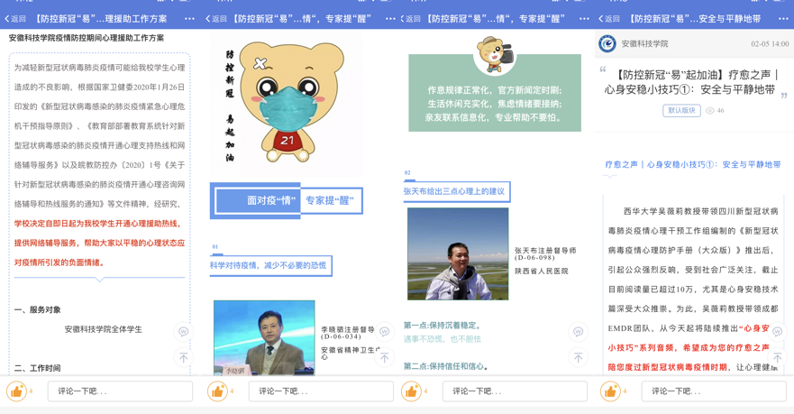 构建全方位的宣传体系,开设“防控新冠易起加油”版块,自1月25日起不间断推送各类疫情防控专题帖50余篇,介绍全国疫情防控形势,个人疫情防控知识,以及学校疫情防控工作部署安排,积极宣传抗疫一线的感人事迹。发起线上“我是安科学子—“易”起承诺”活动,承诺疫情期间科学防控,不传谣不信谣,学习预防并重,绝不提前返校。推送《拼搏平台致全体师生员工一封信》《同舟共济战疫情——致湖北籍大学生的一封信》,有效凝聚起众志成城、共克时艰的强大正能量。