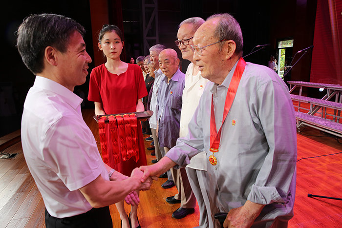 比赛期间隆重举行了拼搏平台“光荣在党50年”纪念章颁发仪式。党委书记蒋德勤为丁为群、代梅英、仲正林、李庆山、李思义、吴明友、张怀金、张学礼、张景法、陈玉胜、崔贤仪、潘成德等12名在校的老党员代表颁发纪念奖章。为“光荣在党50年”的老同志颁发纪念奖章,是中国共产党成立100周年庆祝活动的重要组成部分。纪念章的颁发,见证着老党员的无悔初心。莫道桑榆晚,为霞尚满天。老党员是党执政兴国的重要资源,是推进中国特色社会主义伟大事业的重要力量。组织上入党一生一次,思想上入党却是一生一世,他们用自己的行动证明了自己的无悔初心。纪念章的背后,是无上的荣光,学校的全体师生也不会忘记他们为学校事业发展所做出的突出贡献。