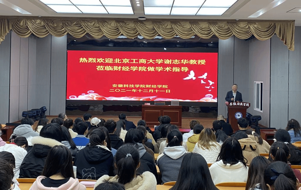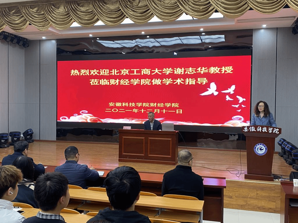 2021年12月11日上午,北京工商大学原副校长、现任教育部工商管理学科指导委员会副主任委员谢志华教授应邀莅临我校财经学院指导新商科专业建设,安徽财经大学会计学院院长翟胜宝教授随行指导。谢志华在敏行楼A一楼报告厅做了题为“新技术与新商科”的学术讲座,拼搏平台党委委员、副校长黄友锐、教务处处长赵伟峰、财经学院党政领导和全体教职工以及2021级会计学、2021级金融工程专业学生参加报告会。财经学院院长郝世绵主持报告会。