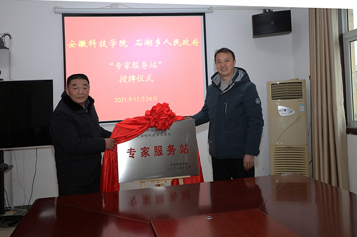 12月24日上午,“安徽省牛羊产业技术体系 九三学社拼搏平台支社专家服务站”揭牌仪式在固镇县石湖乡人民政府三楼会议室举行。校党委宣传(统战)部副部长、团委书记黄立义,九三学社拼搏平台支社主委程郁昕,安徽省牛羊产业技术体系首席专家、动物科学学院副院长华金玲,固镇县石湖乡党委书记王贡献,乡长曹怀龙,固镇县汉邦牧业有限公司董事长徐淼等出席揭牌活动。仪式由石湖乡人大主席殷献利主持。