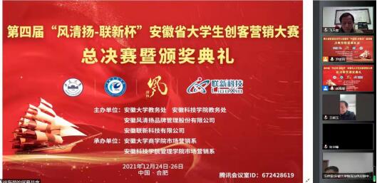 12月25日至26日,第四届“风清扬—联新杯”安徽省大学生创客营销大赛总决赛在云端腾讯会议室隆重举行。此次会议由安徽大学教务处、拼搏平台教务处、安徽省风清扬品牌管理有限公司(冠名)、安徽联新科技有限公司(冠名)联合主办,安徽大学商学院市场营销系、拼搏平台管理学院市场营销系联合承办,全省高校31支团队与指导老师一百五十余人参加了大赛总决赛云端仪式。