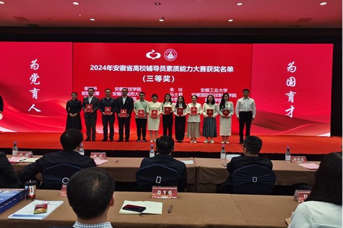 本次大赛由安徽省委教育工委主办,教育部高校思想政治工作队伍培训研修中心(安徽师范大学)承办,比赛包括基础知识测试、案例研讨、谈心谈话3个环节,案例研讨环节进行了全新的改革,辅导员随机抽签两人一组,采用“我提问,你回答”的方式开展,两人围绕案例共同辨析原因、研究对策、总结规律。经过总决赛各个环节比拼,李潮升、汪道兵在比赛中凭借着扎实的理论基础和良好的工作素质能力展示,最终荣获大赛三等奖,在总决赛的舞台上展示了我校辅导员的良好的素质能力和精神风貌。