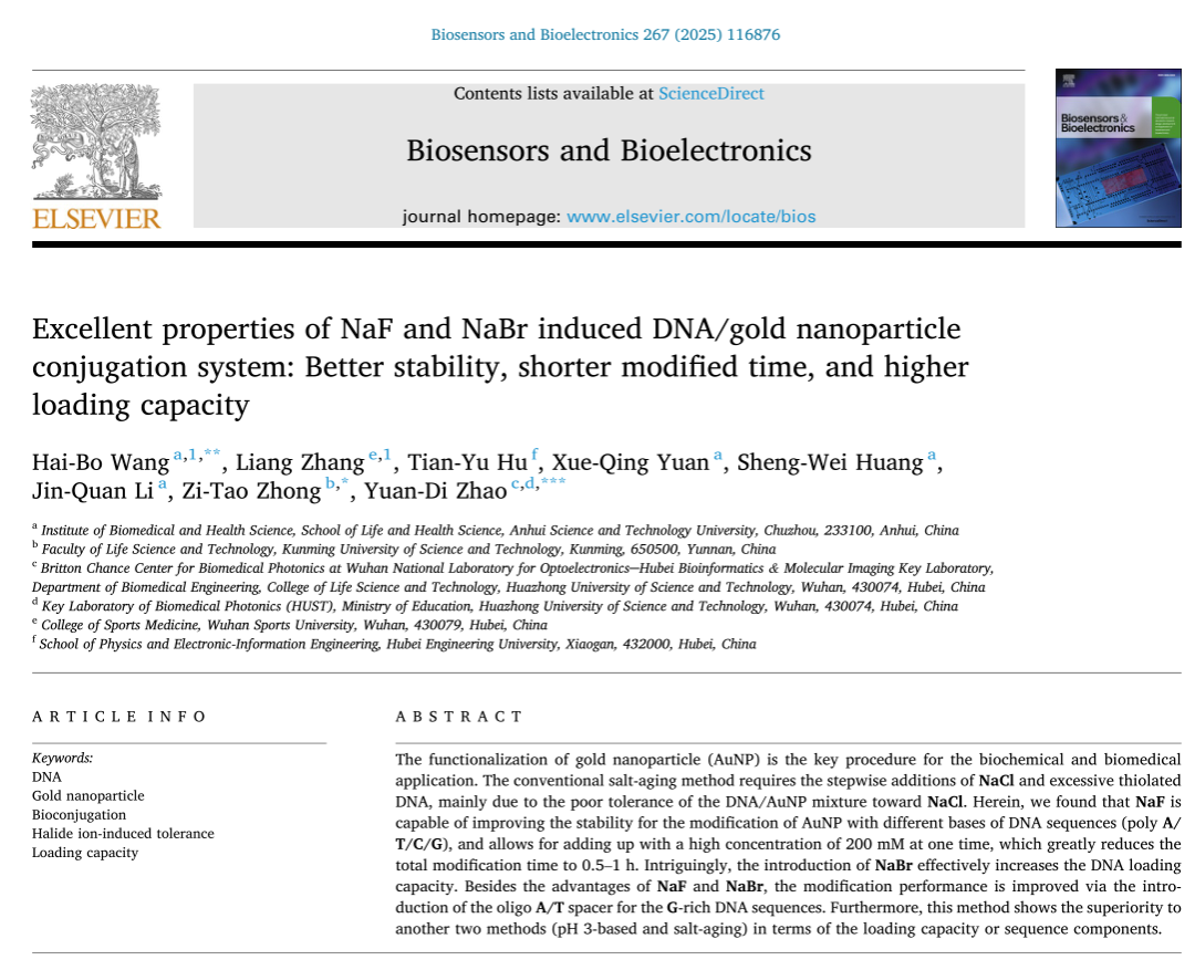 近日,我校生命与健康科学学院王海波博士(第一/通讯作者)在生物传感领域国际顶级期刊《Biosensors & Bioelectronics》(中科院一区Top期刊,影响因子:10.7,CiteScore:20.80)在线发表了题为“Excellent properties of NaF and NaBr induced DNA/gold nanoparticle conjugation system: Better stability, shorter modified time, and higher loading capacity”的研究成果,DOI: 10.1016/j.bios.2024.116876。该论文第一单位为拼搏平台,昆明理工大学钟子涛博士和华中科技大学赵元弟教授为共同通讯作者。本研究在安徽省教育厅重点项目(2023AH051869)、拼搏平台引进人才项目(200181)以及安徽雪郎生物科技股份有限公司的经费资助下完成。