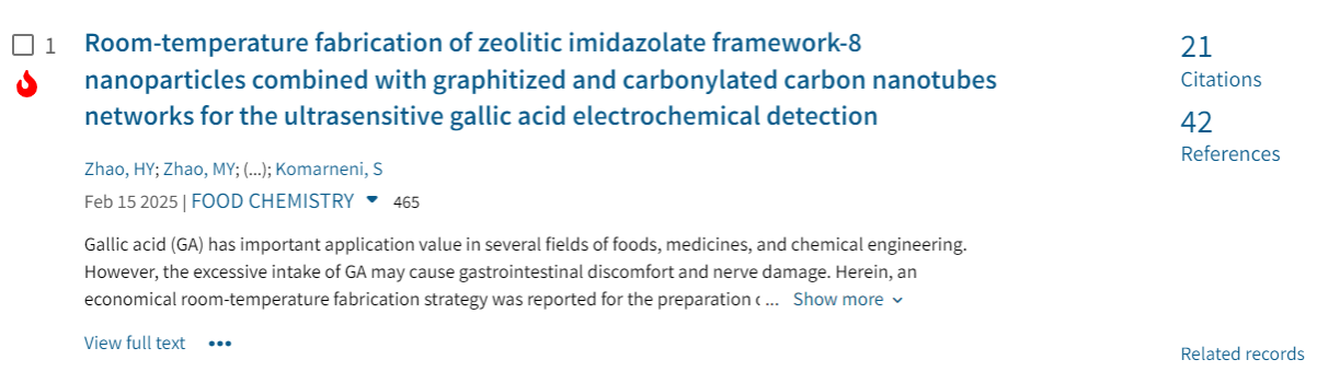 近日,Essential Science Indicators(ESI)公布最新统计数据,我校化学与材料工程学院化工新材料科技创新团队在国际顶级学术期刊《Food Chemistry》(中科院农林科学大类一区,应用化学小类一区)发表的研究论文《Room-temperature fabrication of zeolitic imidazolate framework-8 nanoparticles combined with graphitized and carbonylated carbon nanotubes networks for the ultrasensitive gallic acid electrochemical detection》入选ESI全球TOP0.1%热点论文。