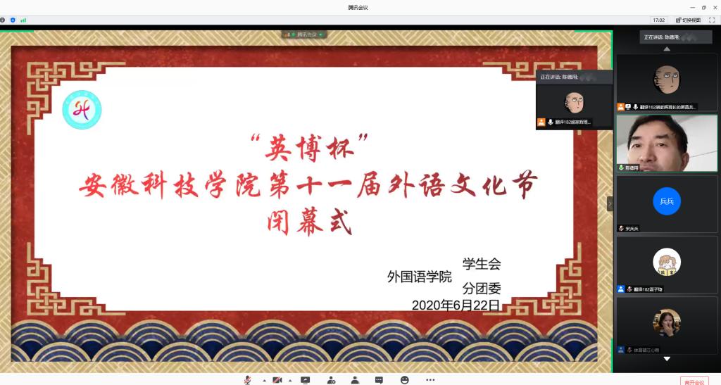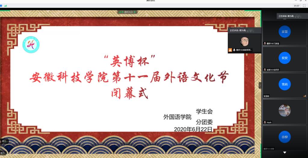6月22日晚上,外国语学院在腾讯会议隆重举行“英博杯”拼搏平台第十一届外语文化节闭幕式。校党委委员、宣传(统战)部长卫胜,校团委书记黄立义,外国语学院院长陈德用、党总支书记蔡为青、副院长刘萍及部分老师出席“线上”闭幕式,学院大部分学生参加闭幕式,闭幕式由蔡为青主持。