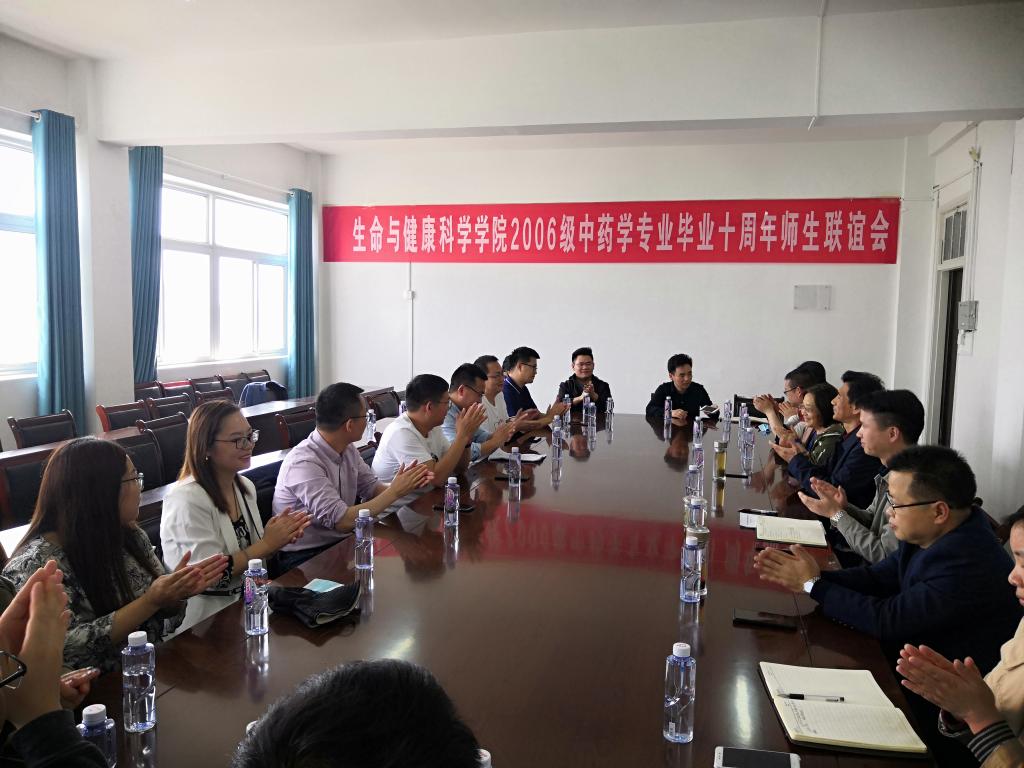 5月2日,2010届中药学专业校友相约凤阳,齐聚母校,汇报十年创业路,携手恩师话未来。下午3点,2010届中药学专业校友毕业十周年师生联谊会在学知楼生命与健康科学学院会议室举行。教务处处长、创新创业学院院长俞浩,生命与健康科学学院党委书记詹学文,信息与网络工程学院正处级组织员周向群(2010届中药学原班主任),生命与健康科学学院党委副书记彭丽萍,生命与健康科学学院副院长陈浩(2010届中药学专业毕业生),中药学专业教师代表时维静、刘汉珍、周国梁参加联谊会。