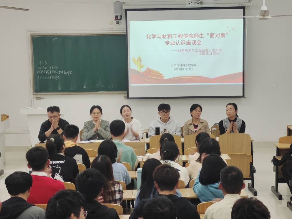 伴随着秋天的脚步,迎着同学们真挚的笑脸,为了帮助2021级新生了解专业方向,稳固专业思想,更好的融入大学生活,11月3日下午,化学与材料工程学院应用化学系教工党支部、无机非金属材料系教工党支部、材料科学与工程系教工党支部、新能源材料与器件系教工党支部在各党支部书记的组织下结对相关专业召开了“师生面对面专业认知座谈会”暨教工支部主题党日活动,4个专业2021级新生分专业参加座谈会。