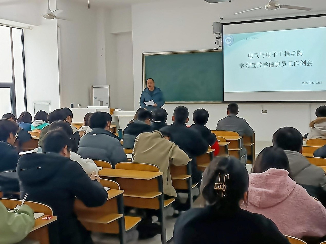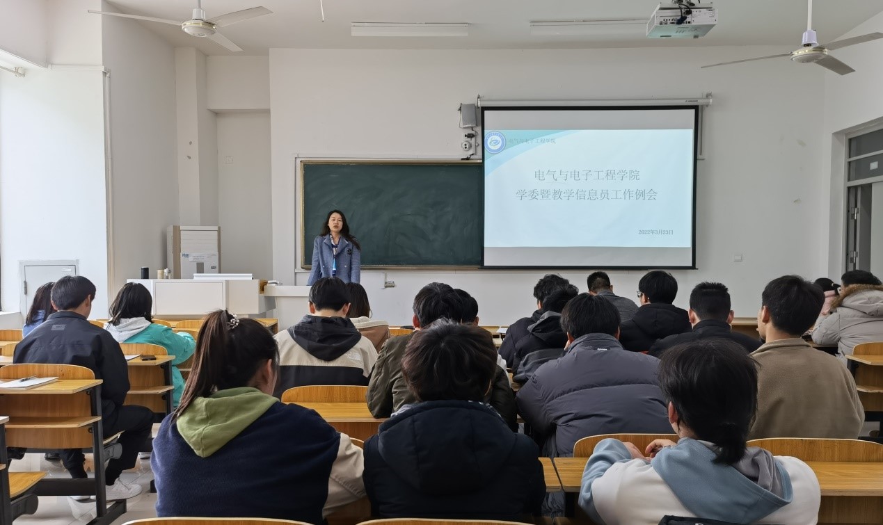 为进一步加强学风建设,提高学习委员履职尽责的能力, 3月23日下午,电气与电子工程学院在致B209教室召开学委暨教学信息员工作例会。电气与电子工程学院党委副书记尚磊,教务员任燕,辅导员陈更强,院学生会学习发展部全体成员以及各班学委参加了此次会议。会议由学习发展部干事王慧茹主持。