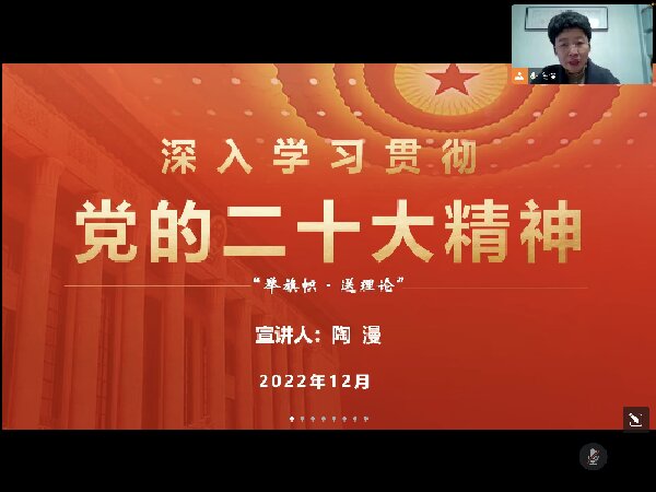 为深入学习宣传贯彻党的二十大精神,提升学生党员和团员青年的政治素质,坚定理想信念,永远跟党走,奋进新征程,12月26日上午,校辅导员理论宣讲团成员、管理学院党委副书记陶漫利用腾讯会议为该学院学生党员、团学干部和团员青年开展了以“青春共话党的二十大,斗志昂扬新征程”为主题的党的二十大精神理论宣讲。
