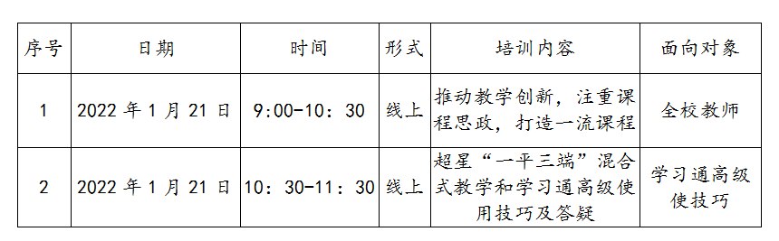 为积极应对当前复杂严峻的新冠疫情防控形势,做好线上教学准备,增强教师智慧教学能力,促进教学创新,注重课程思政,打造一流课程,教务处决定利用寒假开展针对性的线上系列培训活动。