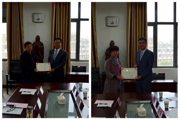 典礼前,陈传万、杜士凤为许文春、郭强颁发了特聘教授证书,并就深化产学研合作进行了商谈。