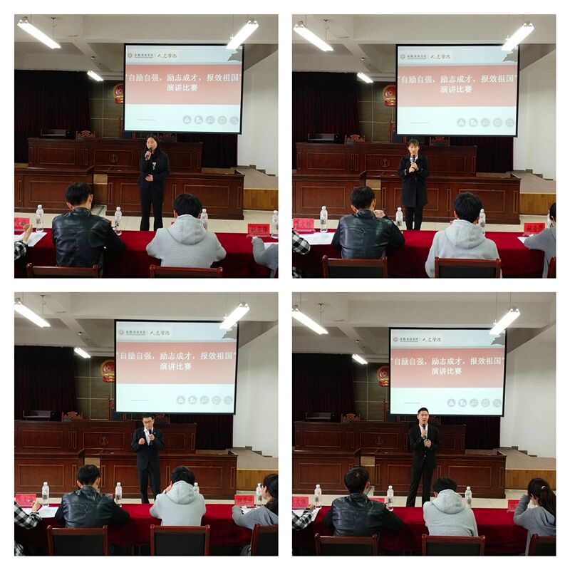 4月14日上午,人文学院在模拟法庭成功举办2018年第五届“自立自强•励志成才•报效祖国”大学生演讲比赛。人文学院学生会副主席方明旺、外国语院学生会学习部部长朱文梅、财经学院学生会学习部部长鲍亚萍、演讲与口才协会会长董成亮受邀担任本次比赛的评委,大赛由衡鑫主持。