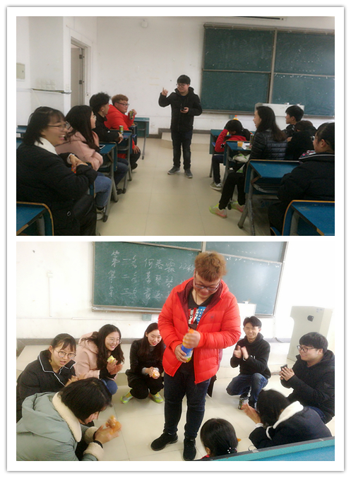 讲座之后,“我是吃货”“镜头美女”等游戏活动轻松登场 。游戏由孙渝主持。“我是吃货”的游戏规则是参赛选手在规定时间内要吃完桌子上分配的食物,用时最少者获胜。通过一番激烈的角逐之后,中文161班的何春霖以10秒成绩摘得桂冠。同学们围坐在一起谈笑风生,气氛和谐融洽。