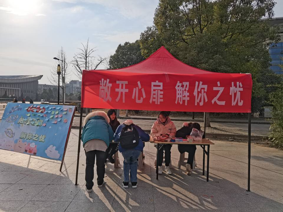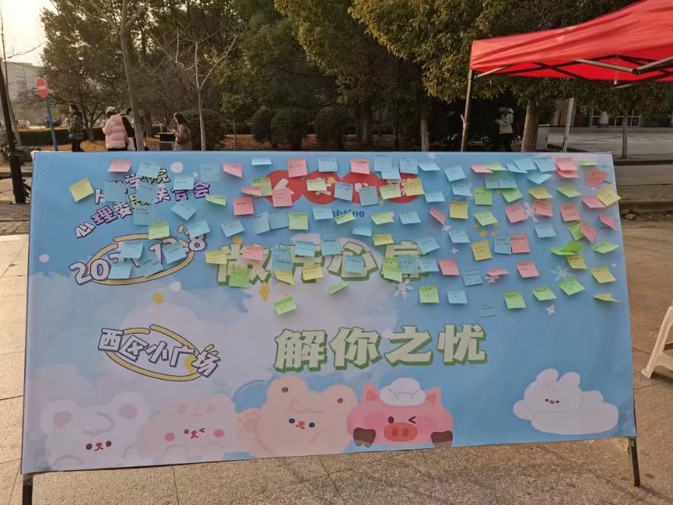 为进一步推动人文学院大学生心理健康教育工作,普及心理健康知识,在全校营造关注心理健康、懂得心理健康、重视心理健康的浓厚氛围,12月8日人文学院心联在西区小广场举办了第一届“12·15”心理健康月特色主题活动——“敞开心扉,解你之忧”。