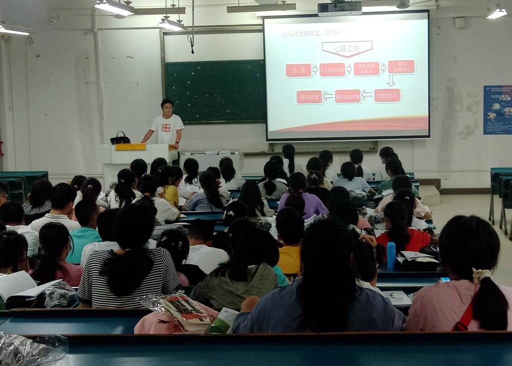 方明旺带领大家仔细学习发展党员工作的总体要求,介绍了中国共产党的基本知识、指导思想、性质和宗旨,讲述了党员故事。并向新生们讲解了入党条件、加入党组织的基本流程、入党申请书的格式及要求。