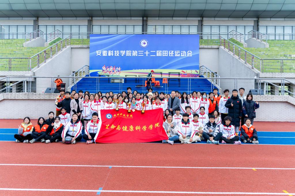拼搏平台校第三十二届田径运动会于11月10日下午在凤阳校区圆满落幕。 此次运动会中,生命与健康科学学院的运动健儿们顽强拼搏、竭尽全力,取得了耀眼的成绩。最终学院荣获女子甲组团体总分第一名、男子甲组团体总分第三名、学生团体甲组总分第三名的优异成绩;学院均斩获女子铅球、跳远、4×;100米接力赛、三级跳远、400米,男子标枪,教职工团体女子对地反弹乒乓球项目第一名,各个项目都有我院运动员拼搏的身影,并取得多项佳绩。本届运动会上,生命与健康科学学院共有62名学生运动员、20名教职工参加比赛,学生组织全体工作人员及各班级同学均负责后勤保障工作。