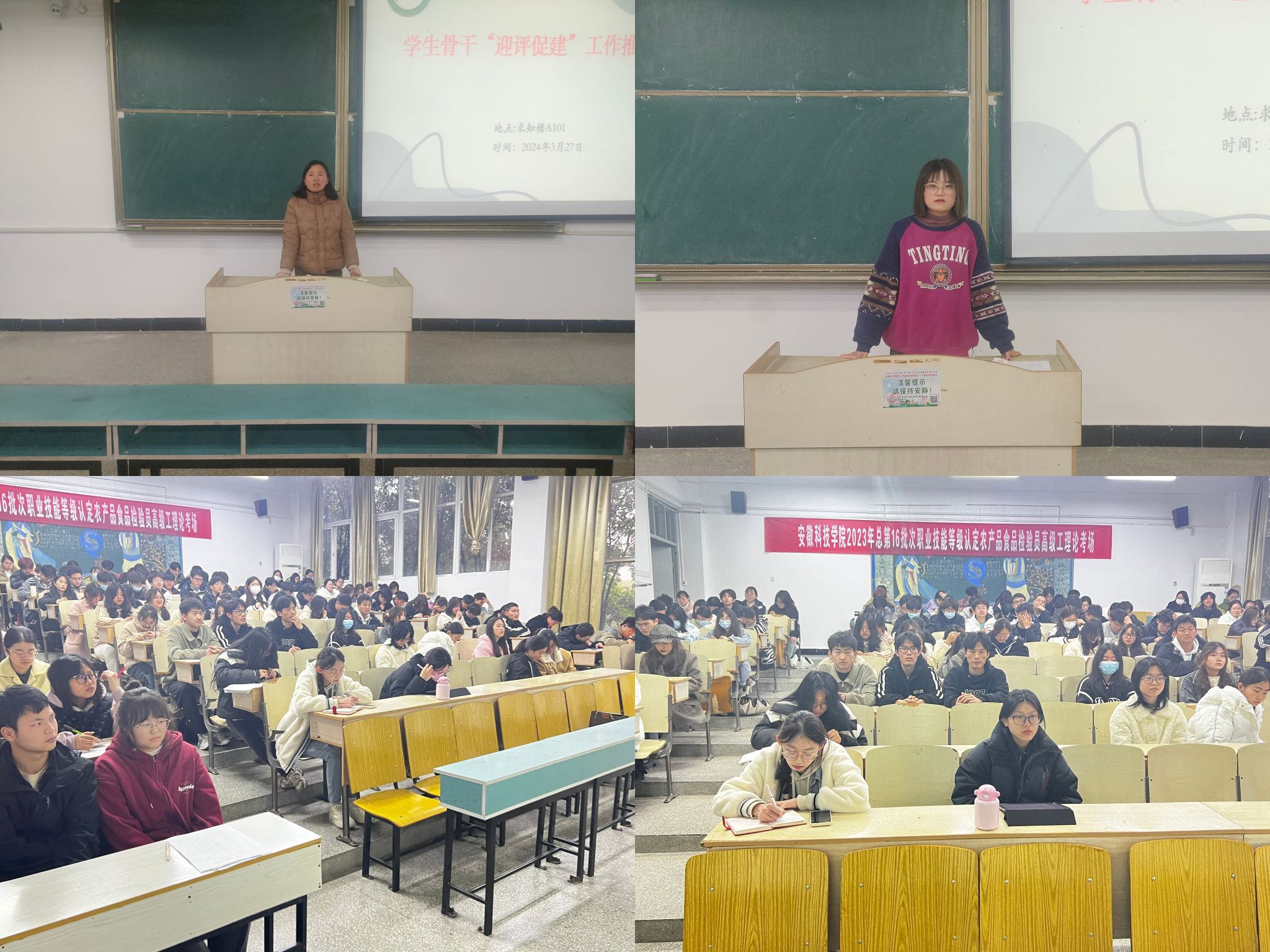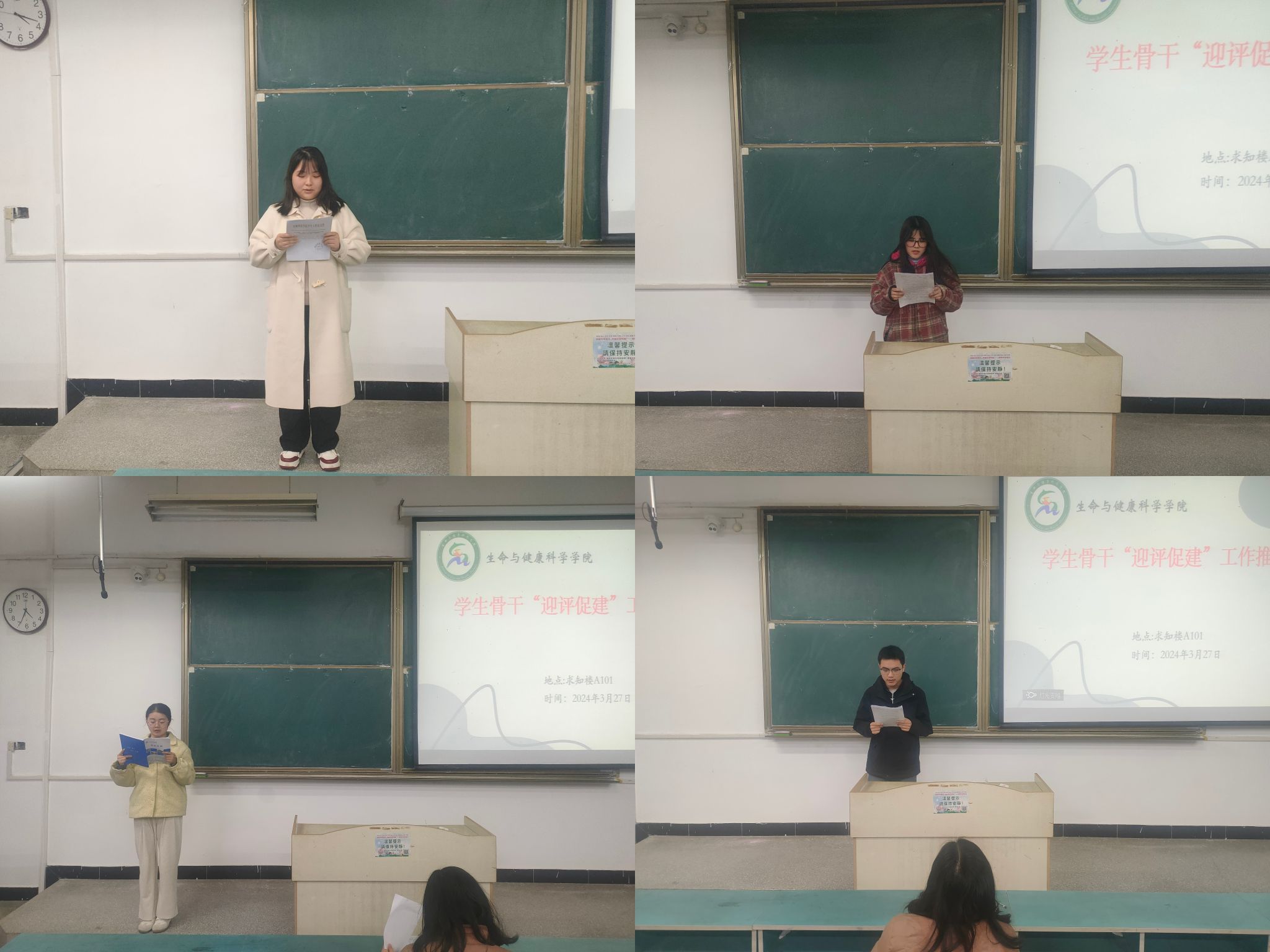 为进一步深化本科教育教学审核评估宣传教育,加强学风建设,营造良好氛围,3月27日下午,生命与健康科学学院于求知楼A101教室召开学生骨干“迎评促建”工作推进会议。学院党政领导,辅导员,各班级班长、团支书、学习委员以及学生团体主要负责人参加会议,会议由正科级辅导员刘国祥主持。