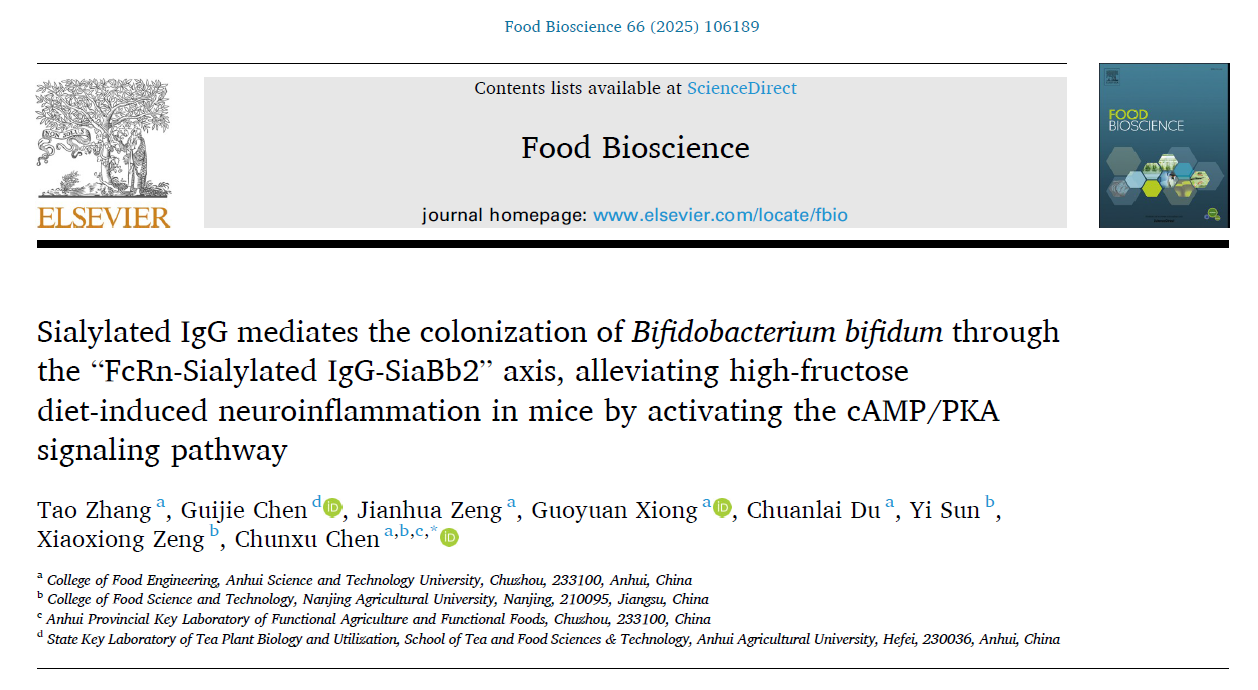 近日,食品科学与工程学院陈春旭副教授以通讯作者身份在国际Top期刊《Food Bioscience》(Q1,影响因子4.8)发表了题为“Sialylated IgG mediates the colonization ofBifidobacterium bifidum through the “FcRn-Sialylated IgG-SiaBb2” axis, alleviating high-fructose diet-induced neuroinflammation in mice by activating the cAMP/PKA signaling pathway”的研究论文,论文的第一作者为拼搏平台2023级食品加工与安全专业硕士研究生张涛,拼搏平台为第一完成单位,南京农业大学曾晓雄教授课题组为合作单位。