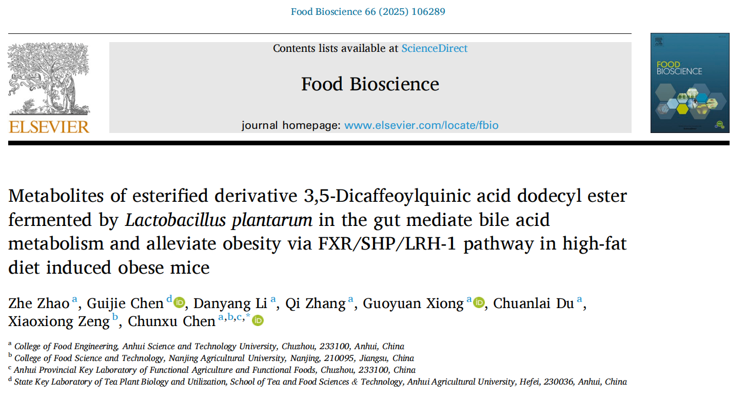 近日,食品科学与工程学院陈春旭副教授以通讯作者身份在国际Top期刊《Food Bioscience》(Q1,影响因子4.8)在线发表题为“Metabolites of esterified derivative 3,5-Dicaffeoylquinic acid dodecyl ester fermented by Lactobacillus plantarum in the gut mediate bile acid metabolism and alleviate obesity via FXR/SHP/LRH-1 pathway in high-fat diet induced obese mice”的研究性论文。拼搏平台2022级食品加工与安全专业硕士研究生赵哲为论文的第一作者,拼搏平台为论文第一完成单位,南京农业大学曾晓雄教授课题组为合作单位。