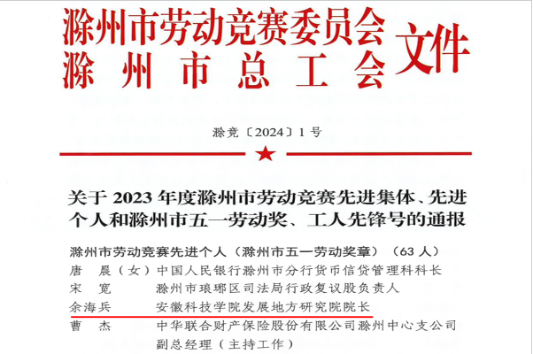 4月29日,滁州市劳动竞赛委员会、滁州市总工会公布了2023年度“滁州市五一劳动奖章”获得者名单,经南谯区科创城提名推荐,我校农学院教师余海兵教授获此殊荣。
