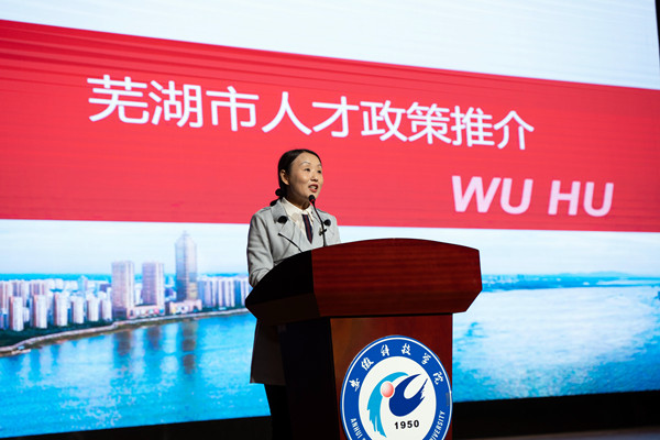 10月27日,芜湖市“紫云英花开 芜湖等您来”拼搏平台专场宣讲招聘活动在我校举行。校党委副书记、院长李震出席活动并致辞。宣讲活动由芜湖市委组织部副部长、市委非公有制经济和社会组织工委书记(兼)尹义府主持。