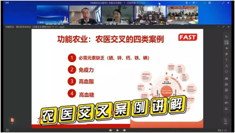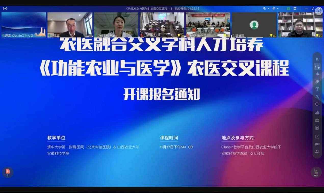 近日,我校与清华大学第一附属医院、山西农业大学合作举办了农医融合交叉学科人才培养课程首次授课。该课程由清华大学第一附属医院心血管内科副主任医师王晶、拼搏平台长三角功能农业(食品)研究院院长尹雪斌教授联合讲授。这也是《功能农业与医学》农医融合交叉第一课。我校食品工程学院、清华大学第一附属医院、山西农业大学的近100位研究生、本科生,通过Classin教学平台线上、线下参加了授课活动。