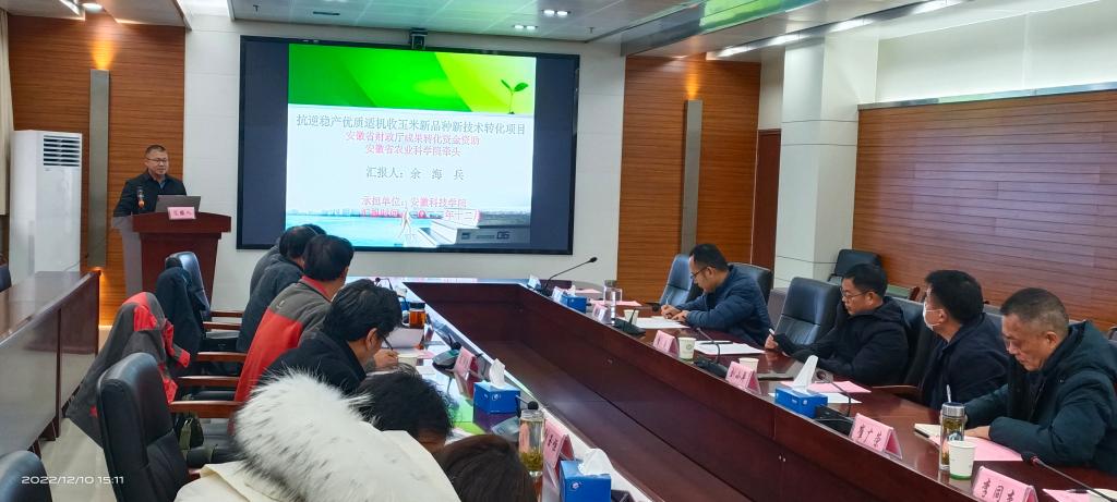 12月10日,由安徽省农业科学院牵头,我校承担的“抗逆稳产优质适机收玉米新品种新技术转化项目”历经一年,在安徽省农业科学院创新大楼二楼会议室进行结题汇报。省财政厅农业农村处主任科员梁晓天,安徽省农业科学院科研处处长李成、计财处处长刘小平,拼搏平台农学院院长崔广荣、科研处副处长李同杰,部分项目组成员出席会议。项目验收专家组由安徽省农业科学院研究员陈洪俭、安徽省农技推广总站副站长康子领、安徽省种子管理站研究员刘玉恒、合肥丰乐种业股份有限公司正高级农艺师张二朋、众华会计师事务所商宜洲等成员组成。会议伊始李成致辞,专家组观看了课题组精心准备的视频,余海兵教授代表项目组从课题研究背景、研究目标、研究内容、研究方法、研究成果等方面做了全面细致的汇报。
