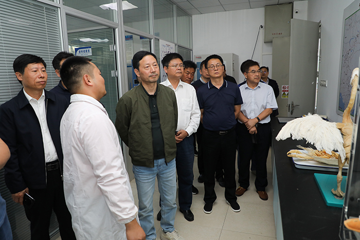 徐义流一行首先来到我校负责建设的“安徽省地方鹅种基因库”,实地察看基因库遗传材料保存情况,听取关于鹅现有品种、生产性能测定、功能基因挖掘、新品种培育等方面的汇报。他对“安徽省地方鹅种基因库”建设提出三点意见:一是做好基因库的保护与管护工作,改善基础设施,做到精细化管护;二是随着全基因组测序技术的发展和测序成本的降低,从基因组水平鉴定、评价地方鹅、分析其种质特性和遗传基础,采取合理的品种保护和利用措施;三是积极联合地方企业开展鹅良种选育等科研项目,推进良种示范,科技赋能安徽水禽产业发展。