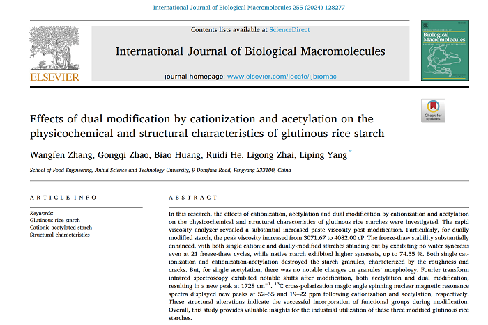 近日,我校2021级食品加工与安全领域研究生张王芬在生化与分子生物学领域Top一区期刊International Journal of Biological Macromolecules(IF=8.2)在线发表题为“Effects of Dual Modification by Cationization and Acetylation on the Physicochemical and Structural Characteristics of Glutinous Rice Starch”的研究论文。食品工程学院粮油及其副产物精深加工团队与营养科技创新团队负责人杨丽萍副教授为通讯作者,拼搏平台为唯一完成单位。