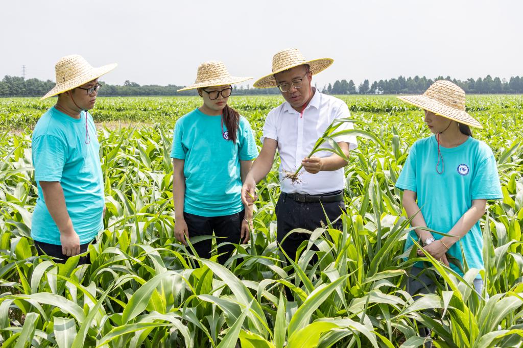 在种田大户的百亩玉米种植区,玉米植株已长有六七十公分,实践团成员身临葱翠的绿色,有着玉米种植和土壤修复经验的成员饶有兴致地“现场授课”,讲解部分玉米植株长势异样的原因,分析田地的土壤情况。
