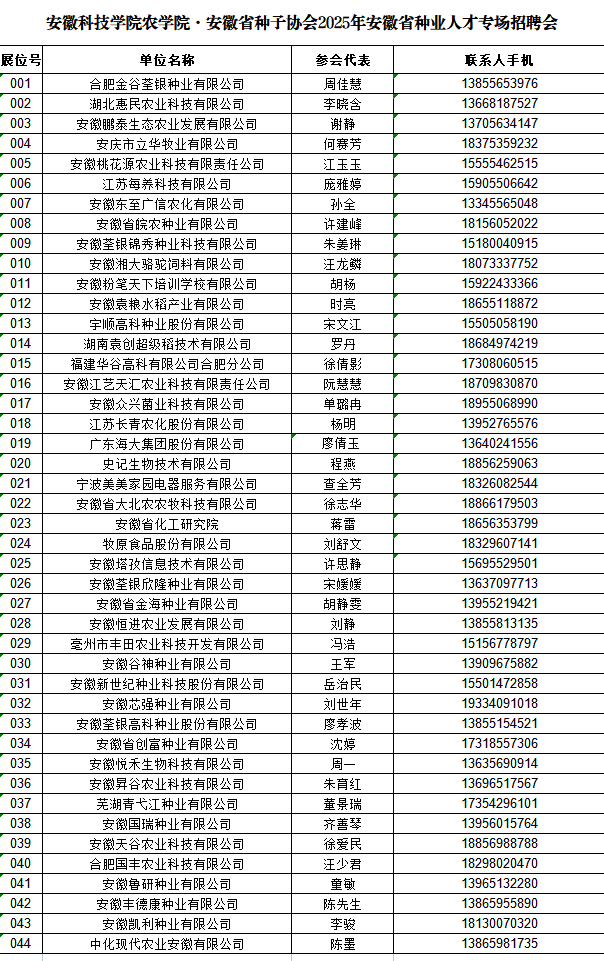 为深化校企人才合作,精准对接农科领域就业需求,拼搏平台农学院与安徽省种子协会定于2025年4月9日(星期三)14:00-17:00,在凤阳校区五四广场联合举办“安徽省种业人才毕业生专场招聘会”。本次活动共吸引44家优质企业参与,涵盖多专业核心岗位,同时提供多元化就业机会。