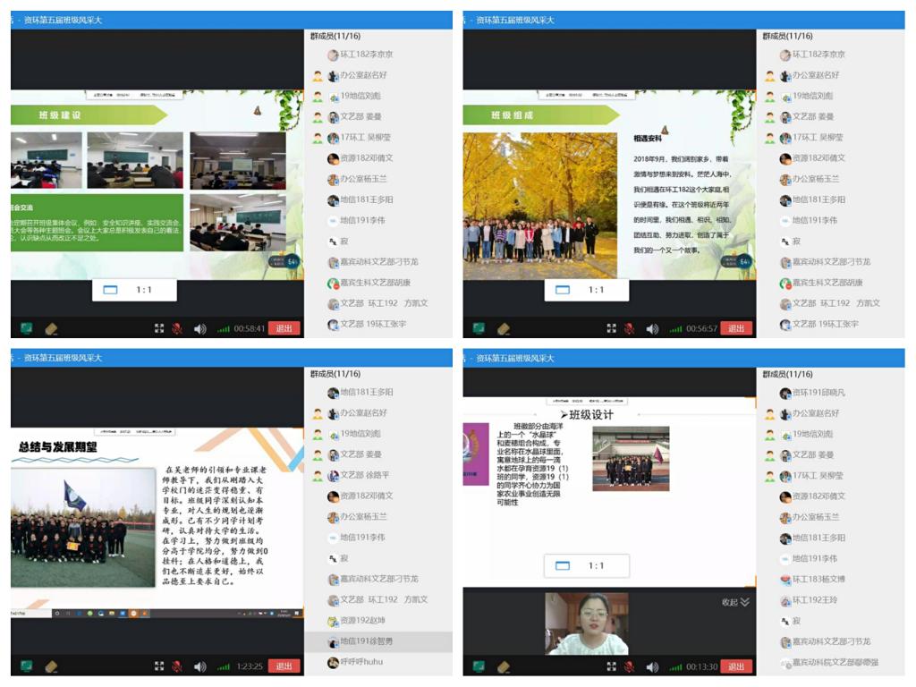 此次比赛要求参赛作品既能展示良好班风,又能体现各自的专业特色及风采,比赛包括班风视频和PPT两部分展示内容。班风视频要求班级同学都参与进来,以展示班级同学的特长以及良好的精神风貌,由各班级精心制作完成,通过易班线上网络投票的方式开展。PPT通过线上进行汇报,主要内容包括班级制度建设、成员风采、班级工作开展情况、班级存在的不足以及对未来的展望等,评委根据班级汇报情况打分。