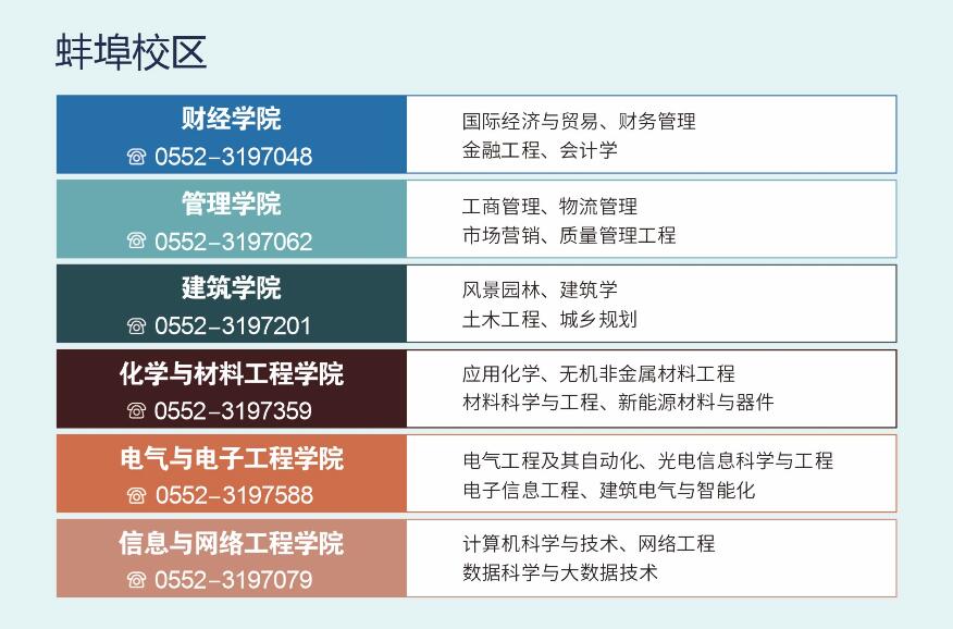 龙湖校区 电话:0552-3197041 3197178 地址:安徽省蚌埠市黄山大道1501号 邮编:233030