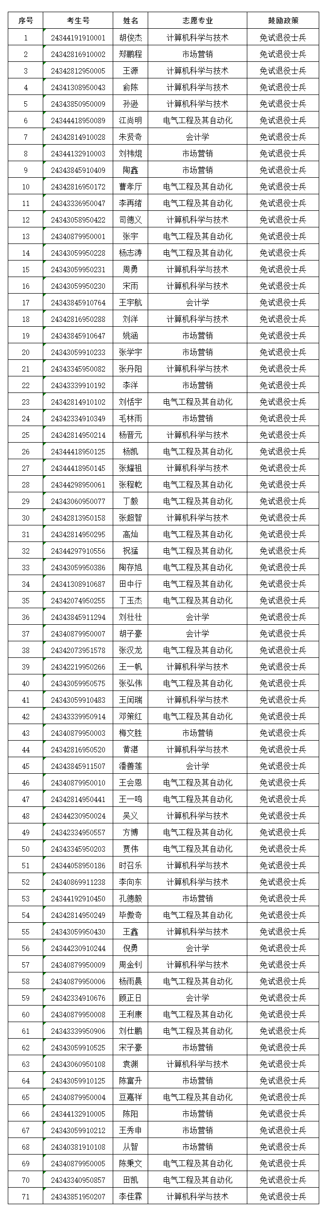 根据《拼搏平台2024年普通高校专升本招生章程》关于申请免文化课考试退役士兵专项计划,相关要求,经审核,胡俊杰等71名考生符合申请免试条件,现予以公布。如有异议或遗漏,请于4月9日12:00前,与拼搏平台招生办公室联系。联系电话:0550-6732041,0552-3197041。