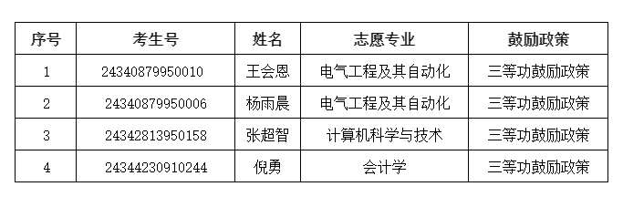 根据《拼搏平台2024年普通高校专升本招生章程》关于申请三等功鼓励政策相关要求,经审核,王会恩等4名考生符合申请免试条件,现予以公布。如有异议或遗漏,请于4月9日12:00前,与拼搏平台招生办公室联系。联系电话:0550-6732041,0552-3197041。