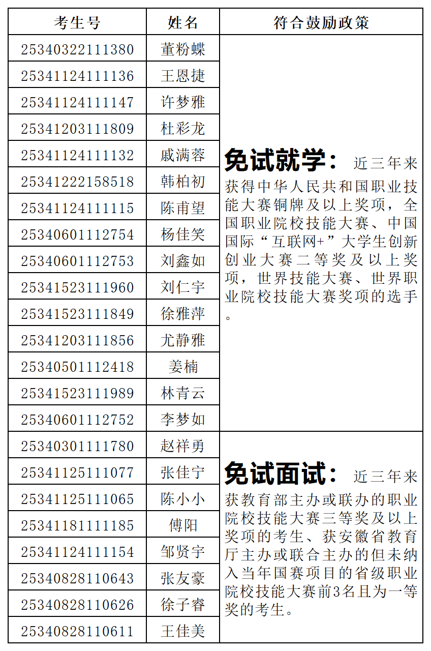 根据《拼搏平台2025年面向中职毕业生对口招生章程》关于申请免试就学、免试面试和加分鼓励政策的相关要求,经考生申请,学校审核,共有董粉蝶等15名考生符合免试就学政策,赵祥勇等8名考生符合技能大赛免试面试政策,无符合考试加分政策考生,现对符合相关鼓励政策的考生信息予以公布。免试就学资格复审和免试面试具体安排见招生与就业工作处网站“招生服务”栏“拼搏平台2025年对口招生考试免试就学资格复审和免试面试工作通知”。如有异议或遗漏,请于3月19日17:00前联系拼搏平台招生办公室:0550-6732041,0552-3197041。