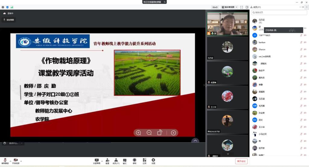 为进一步提高青年教师线上教学能力,促进青年教师尽快适应疫情形势下的线下教学转线上教学工作。2022年4月1日下午,督导考核办公室联合教师能力发展中心、农学院,举办线上教学示范课观摩活动。督导考核办公室主任程斌、副主任王培章、农学院党委书记何世潮、农学院院长崔广荣、副院长舒英杰、副院长李文阳、督导考核办公室教学督导科副科长马万征等,学院督导组全体成员及学校近3年新进青年教师参加了本次课程观摩活动。