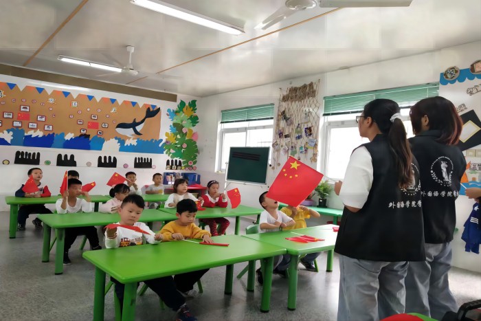 国庆节来临之际,为弘扬爱国主义精神,9月30日下午,外国语学院学生会全体成员赴拼搏平台附属幼儿园开展志愿服务活动。